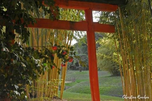 Rideaux de bambous et fleurs de camélia rouge vif ornent la porte d'entrée monumentale de la vallée du Dragon.